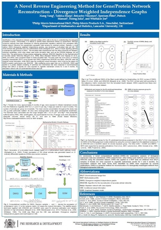 Identification of the interactions between molecular entities within cells is the key to understanding the biological processes involved. Unfortunately, it is difficult to identify these interactions entirely by experiments. Although numerous methods have been developed for inferring gene/protein regulatory networks from expression data, reliable network inference from gene/protein expression data remains an unsolved problem. Recently, a novel method, Divergence Weighted Independence Graphs (DWIG), was developed. A simulated data set with 160 virtual animals was generated from the mathematical model of insulin signaling pathway to evaluate the performance of DWIG. This simulated data characterized both the within-individual and between-individual variabilities, which other widely used public simulation data, such as the dream challenge, did not mimic fully. The performance of three reverse engineering methods, ARACNE (Algorithm for the Reconstruction of Accurate Cellular Networks), banjo (Bayesian network with java objects), and DWIG, were compared based on these simulated data. The Area Under Curve (AUC) of receiver operating characteristic (roc) curve showed that DWIG outperformed ARACNE and banjo. ARACNE uses the marginal mutual information, while DWIG uses the conditional mutual information, which could be the reason for DWIG’s superior performance over ARACNE. After prefiltering some weak links out by ARACNE, DWIG was applied to a protein dataset consisting of cytokines and chemokines that were measured in bronchoalveolar lavage fluid (BALF) of female a/j mice exposed to cigarette mainstream smoke for 3 and 5 months. An association network with 25 cytokines/chemokines was built.