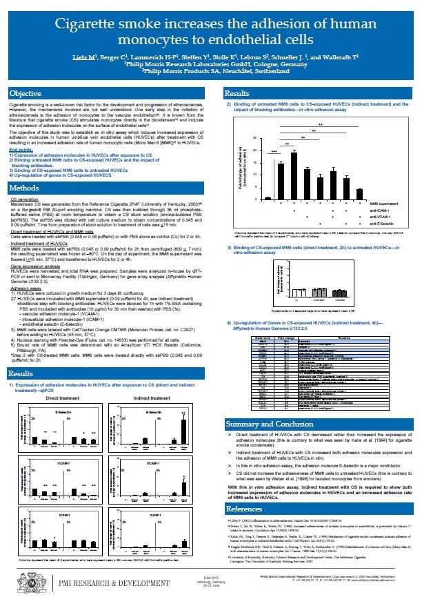 Cigarette smoking is a well-known risk factor for the development and progression of atherosclerosis. However, the mechanisms involved are not well understood. One early step in the initiation of atherosclerosis is the adhesion of monocytes to the vascular endothelium. The objective of this project was to investigate the impact of cigarette smoke (CS) on the adhesion properties of human monocytic cell line Mono Mac 6 (MM6) to human umbilical vein endothelial cells (HUVECs) in vitro. CS was bubbled through phosphate-buffered saline (PBS) and further diluted with cell culture medium to concentrations of 0.045 or 0.09 puffs/ml. HUVECs were exposed to CS preparations for 2 or 4 hours, and a gene array analysis (affymetrix) was performed. Up-regulation of three different adhesion molecules—vascular adhesion molecule-1 (VCAM-1), intercellular adhesion molecule-1 (ICAM-1), and endothelial selectin (E-selectin)—was confirmed by real-time polymerase chain reaction (PCR) and InCell-Western. To test whether the CS-induced up-regulation of adhesion molecules on the surface of the HUVECs was sufficient for the adhesion of MM6 cells, an in-vitro adhesion assay under static conditions was established. Additional adhesion experiments with blocking antibodies against VCAM1, ICAM1, and E-selectin showed E-selectin to have the strongest impact on the CS-induced adhesion of MM6 cells to HUVECs. Adhesion of peripheral blood mononuclear cells is reported to be higher in smokers than non-smokers; therefore, the adhesion properties of CS-exposed MM6 cells to untreated HUVECs were also investigated. No increased adhesion was detected. Conclusion: exposure to CS increases the adhesion of human monocytes to HUVECs in vitro.